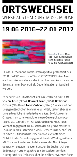 Parallel zur Susanne Paesler-Retrospektive präsentiert das SCHAUWERK unter dem Titel ORTSWECHSEL eine Auswahl von Werken, die aus der Sammlung des Kunstmuseum Bonn stammen bzw. dort als Dauerleihgaben präsentiert werden.