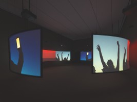 The video installation Wilderness is a highlight of the exhibition. The installation is designed in a circular format, with a 360-degree projection encompassing four screens. Created over a period of two and a half years on a beach in Los Angeles close to where Aitken lives and works. Geographically bounded by the restrictions of the Covid-19 pandemic, the artist went to the edge of the Pacific Ocean every day. He observed a recurring existential energy at sunset with the ebb and flow of people gathering on the beach and the primal ritual of watching the day transform into the darkness of night.