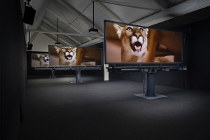 The second major installation is migration (empire) (2008). The work consists of three steel billboards, each equipped with five-metre-wide screens. Abandoned cities, houses and landscapes pass engaging the viewer in a visual road trip. The artwork was filmed in roadside motel rooms in different cities over thousands of miles across the USA. The work offers a series of vignettes showing North American migratory animals exploring these hotel rooms.